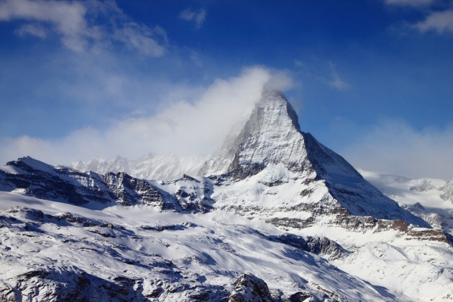 Пик Маттерхорн, не самая высокая вершина в Швейцарии (4478 м), однако ей нет равных, с точки зрения сложности, альпинистских восхождений. Маттерхорн расположен на границе Швейцарии и Италии, итальянское название Червино, имеет форму правильной пирамиды и очень красива, недаром ее избрали одним из национальных символов Швейцарии. Четыре ребра образуют эту идеальную, природную пирамиду с довольно пологим, восьмидесятиметровым горизонтальным гребнем.