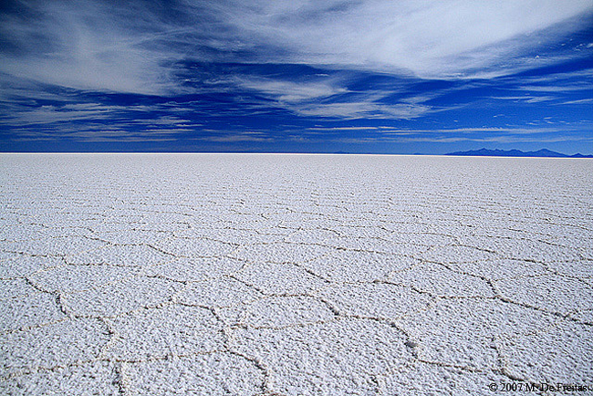 Завораживающая по красоте соляная пустыня, раскинувшаяся на десять с половиной тысяч квадратных километров, на высоте 3650 м. над уровнем моря, у подножья грандиозных гребней Анд. Это крупнейший солончак в мире, он занимает часть территории грандиозного доисторического озера Минчин, высохшего, примерно, 40 тыс. лет назад и распавшееся на два современных озера и соляные пустыни.