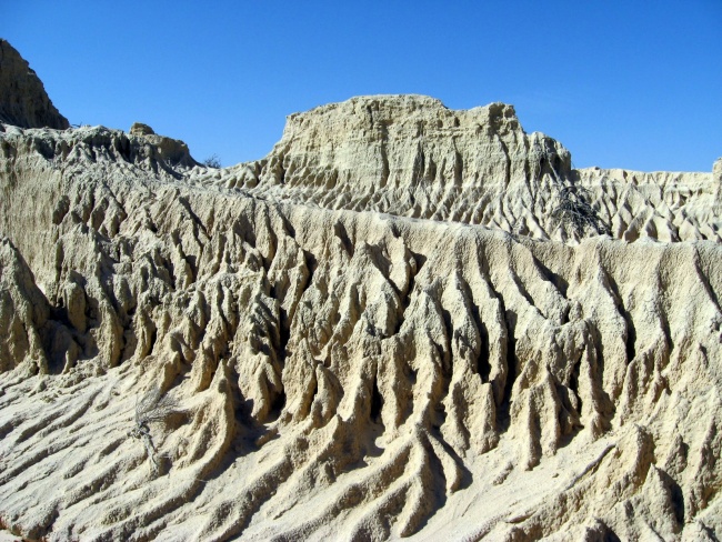 Уникальный лунный пейзаж открывается пред взором, скопление каменисто-песчаных образований, меняющих свой цвет в зависимости от освещения, от серого до красно-желтого, завораживает. Вся поверхность испещрена рельефными "шрамами". Тут и там натыкаешся на кости давно умерших зверей и птиц, причем произошло это, тысячелетия назад, археологи откопали здесь останки гигантского кингуру, сохраненные в "лунетте", как в самом надежном хранилище.