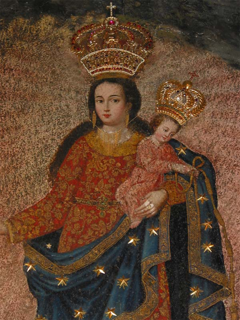 На месте, вблизи которого ныне сооружена церковь, согласно легенде находилась пещера, пользовавшаяся у местных жителей недоброй славой и которую обходили стороной, но однажды в 1754 году здесь произошло чудо явления Богородицы женщине по имени Мария Mуэсес, прачке из Потоси, и еë глухонемой дочери Розе. Ливень застал их близ "не хорошей" пещеры, как только девочка вошла в пещеру, возвестила, свободно на испанском языке, матери об увиденном на скале нерукотворном изображение Богородицы с младенцем на руках. После того, как абсолютно глухонемая девочка сообщила весть о появлении на скале лика Богородицы, икона была признана чудотворной.