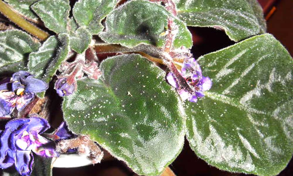 Листья и цветки фиалок покрываются белым мучнистым налетом. Через некоторое время листья вянут, начинают отмирать и в результате растение погибает.