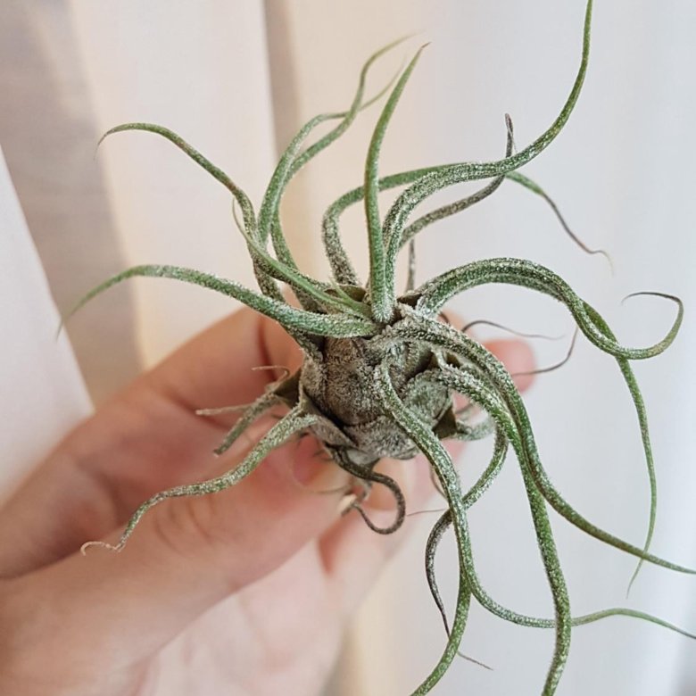 Считается одним из самых распространенных сортов тилландсии, который характеризуется высокой выносливостью. Главной особенностью растения является его неординарная форма, внешне имеющая сходство луковицы с плотно сомкнутыми листочками у основания. Розетка, как правило, «висит вниз головой» и только лишь отдельные ее отростки могут разветвляться в стороны. В период цветения экзотическая «гостья» радует ярко-фиолетовыми пальцевидными и линейными бутонами, их длина составляет до 3,2 см.