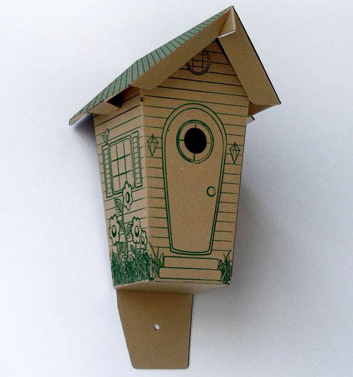 Смастерить скворечник из картона не составит большого труда. А для птичек такой домик прослужит целый сезон. Защитите скворечник от влаги, покрыв картон лаком.