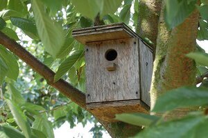 - Повесьте скворечник на высоту от 3 метров с небольшим наклоном вперёд, чтобы внутрь не попадала влага.