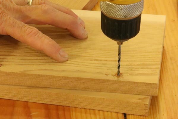 Чтобы при сборке доски не потрескались, под шурупы предварительно сверлим отверстия. Диаметр — чуть меньше диаметра шурупа.
