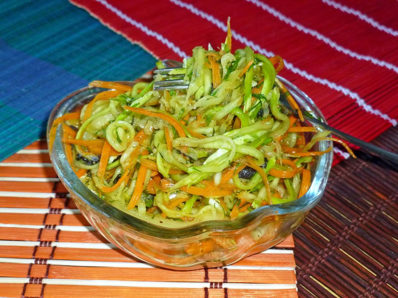 Не традиционная для корейского салата нарезка кабачков и моркови смотрится необычно, но закуска получается вкусной.