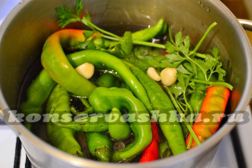 В кипящий маринад выложите острый перчик, убавьте нагрев на минимум, засеките 5 минут. Нельзя допускать сильного кипения, иначе плоды повредятся и разварятся.