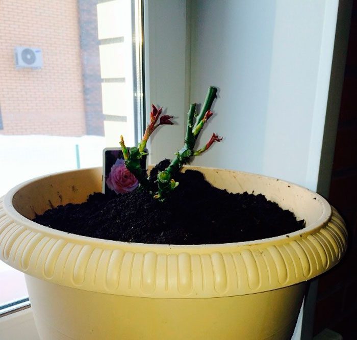 В небольшой горшок объемом около 200 мл с отверстиями внизу примерно на 1/4 насыпают дренаж – мелкие камешки, керамзит и т. д. Следом добавляют специальный грунт для роз, помещают черенок с корешками и поливают теплой отстоянной водой. Излишки должны вылиться через дренажные отверстия.