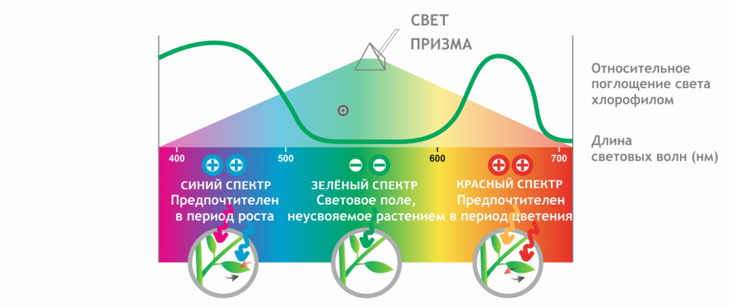Искусственные источники освещения дают свет в той или иной степени похожий на дневной, но не во всем спектре. Известно, что хлорофилл, который непосредственно трансформирует энергию света в энергию органических соединений, лучше всего поглощает свет в красной и синей частях спектра. Сине-фиолетовый свет способствует росту зелёной массы на первых стадиях развития растений, красный свет ускоряет прорастание семян и рост побегов.