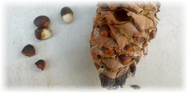 Затем шишка трётся между двумя неровными плоскостями, теряя драгоценный орех.