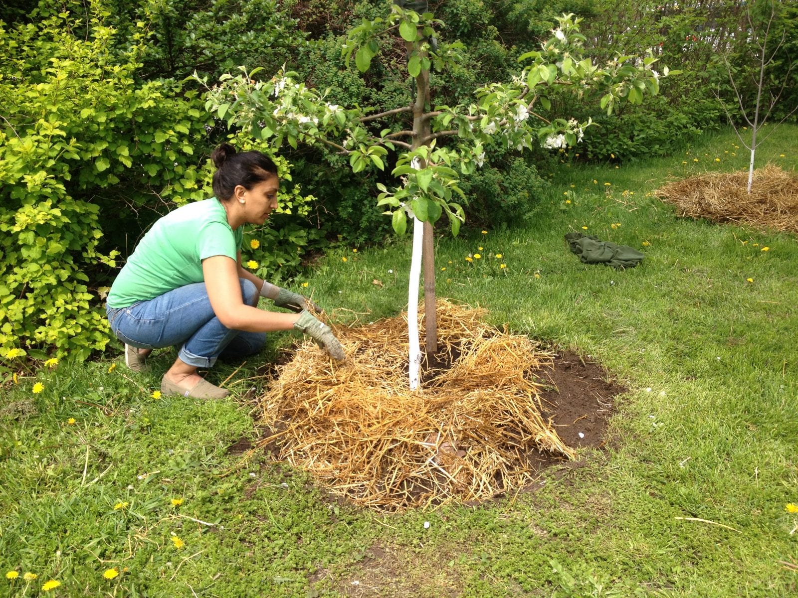 По краю посадочной ямы нужно насыпать валик из земли, чтобы возле саженца образовалась лунка. Теперь саженец можно пролить 2-3 ведрами воды, и когда влага впитается, замульчировать приствольный круг любым подручным материалом (торф, опилки, перегной и т.д.). Подвяжите посаженное деревце к колышку восьмеркой без плотных затяжек обыкновенным шпагатом. Если погода засушливая и дождей не предвидится, поливайте саженец каждые 10 дней.