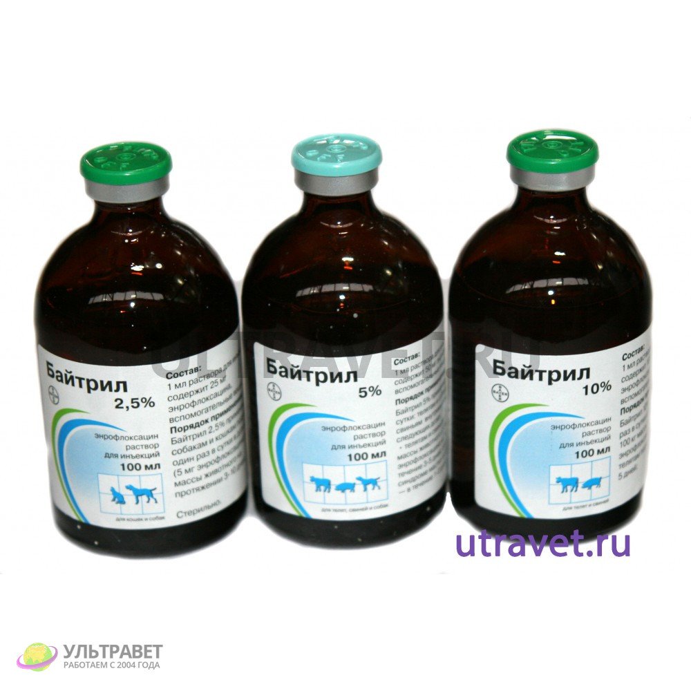 Антибиотик нового поколения группы фторхиналонов для иньекций. Основное действующее вещество энрофлоксацин. Выпускается во флаконах по 100 мл с 2,5% содержанием действующего вещества (25 мгэнрофлоксацина на 1 мл), а также с 5% содержанием энрофлоксацина (50 мг на 1 мл) и 10% содержанием (100 мг на 1 мл). Байтрил показал высокую эффективность по отношению к большинству грамположительных и грамотрицательных бактерий. В качестве вспомогательных компонент: окись калия гидрата, спирт бутиловый 30 мг, стерильная вода для инъекций.