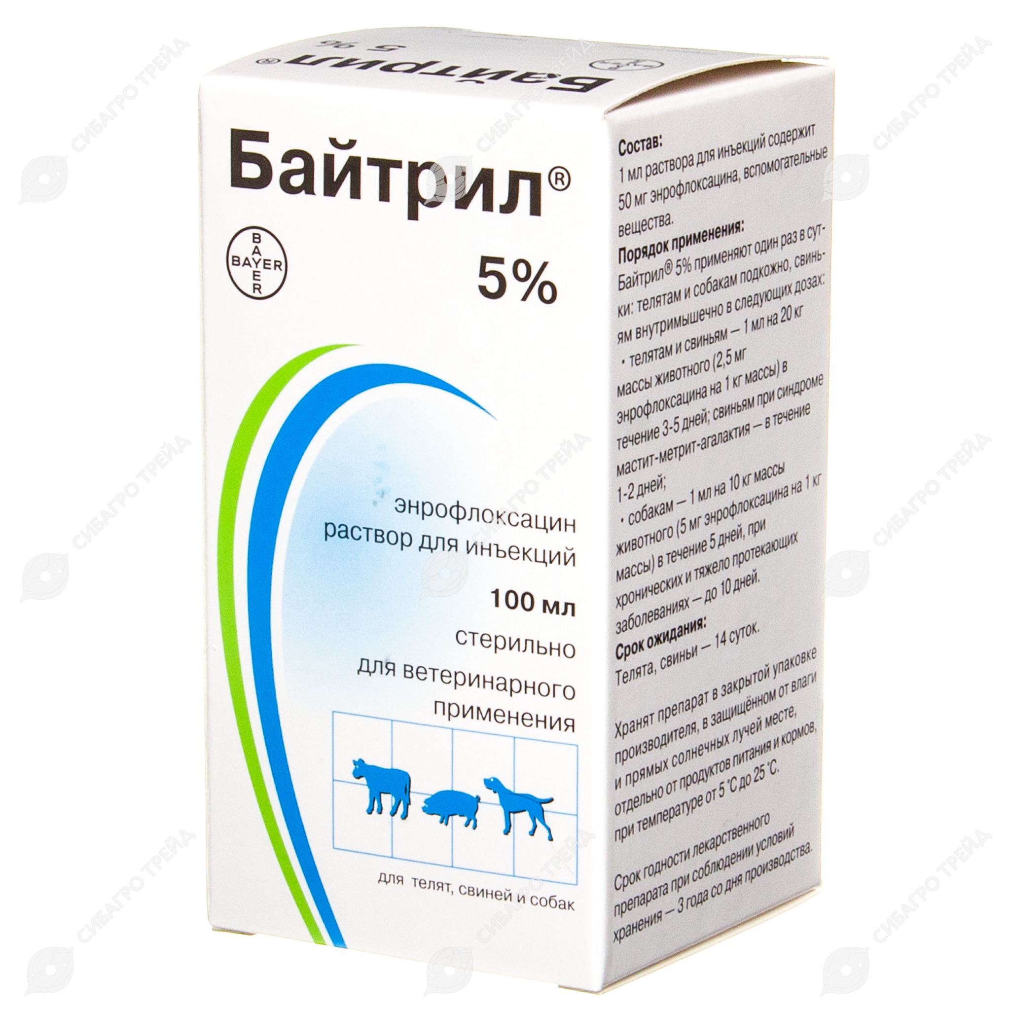 Байтрил 5% инъекционный раствор вводят телятам и собакам подкожно, свиньям внутримышечно в следующих дозах: телятам и свиньям — 1 мл на 20 кг массы животного (2,5 мг энрофлоксацина на 1 кг массы) один раз в сутки в течение 3 – 5 дней, свиноматкам при синдроме мастит-метрит-агалактия — в течение 1 – 2 дней; собакам — 1 мл на 10 кг массы животного (5 мг энрофлоксацина на 1 кгмассы) один раз в сутки в течение 5 дней, при хронических и тяжело протекающих заболеваниях — до 10 дней. В связи с возможной болевой реакцией препарат не следует вводить в одно место крупным животным в объеме, превышающем 5 мл, и мелким животным в объеме, превышающем 2,5 мл. Если в течение 3 – 5 дней не произойдет заметного клинического улучшения, рекомендуется провести повторную проверку на чувствительность выделенных от больного животного микроорганизмов к фторхинолонам или заменить Байтрил на другой антибактериальный препарат.