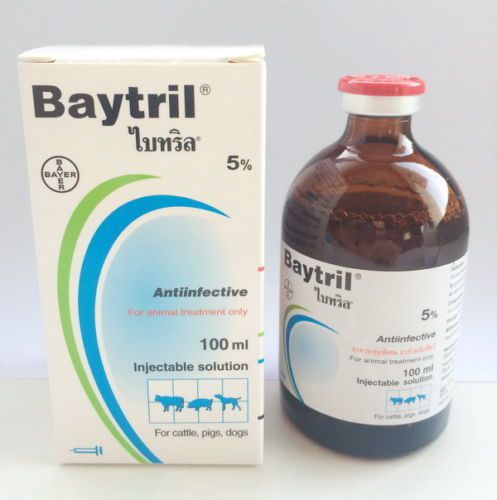 Рекомендуемая доза 5 мг на 1 кг массы: Байтрил 5% — 0.1 мл/кг. Препарат вводят подкожно, внутримышечно один раз в сутки. Курс лечения в среднем 5 дней. Байтрил применяется также для лечения экзотических животных и птиц. Животные Показания Дозировка и длительность курса лечения