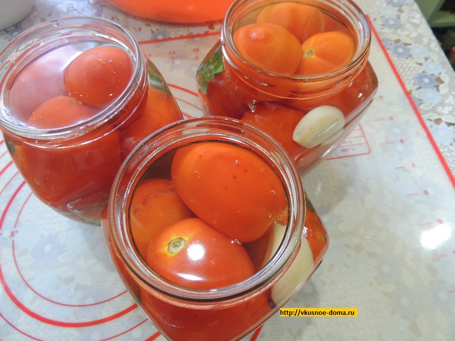 Заливаем кипящим маринадом помидоры в банках. Банки сразу закрываем крышками. Переворачиваем банки вверх дном, укрываем теплым материалом и оставляем на ночь при комнатной температуре до полного остывания.