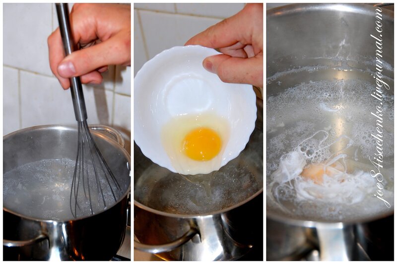 В течение 4-х минут подкручивать белок яйца в воде, которое будет плавать по кругу. Я пошировала по 1 яйцу.