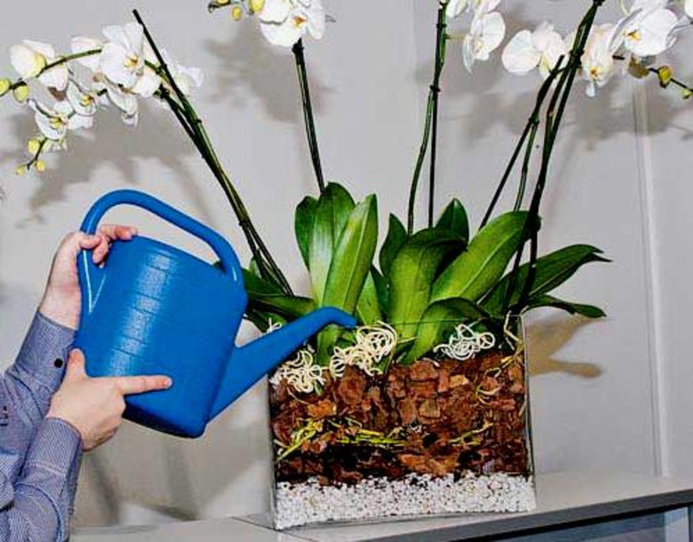 При поливе орхидей также рекомендуется использовать дистиллированную или дождевую воду. Минералов может стать слишком много для этих растений, а минералы будут оставлять водяные пятна на листьях. При пересадке обязательно используйте кору орхидеи.