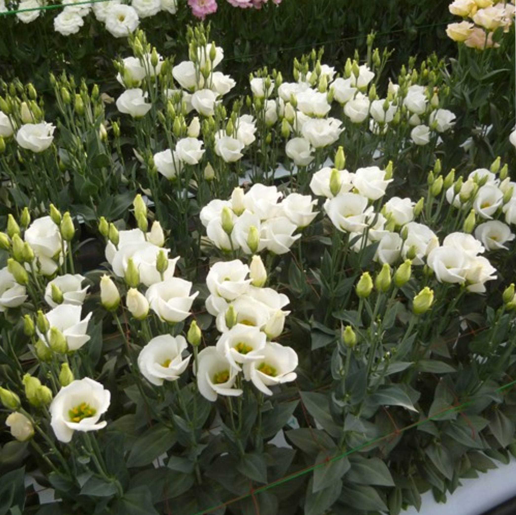 Крупноцветковый белый (Lisianthus grandiflorum), пожалуй, один из самых впечатляющих сортов. Это именно та эустома, из которой делают свадебные букеты и которой украшают интерьеры банкетных залов. Очень эффектный и роскошный сорт.